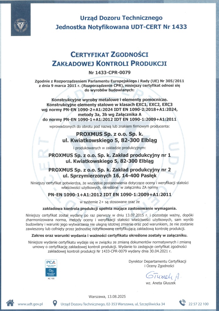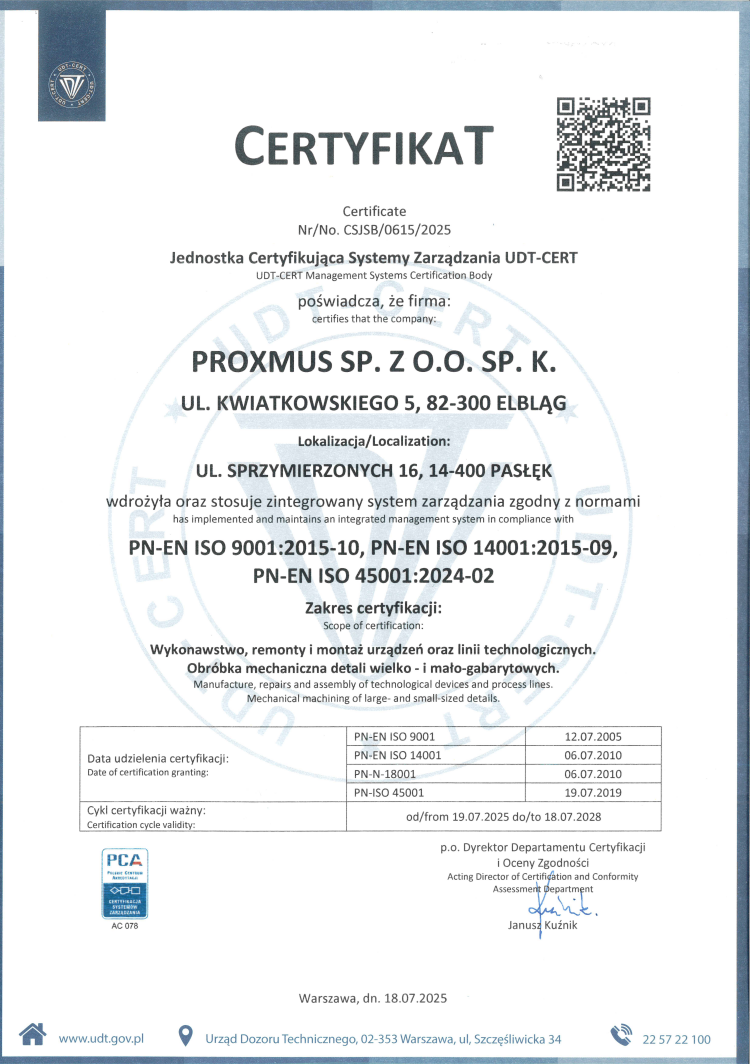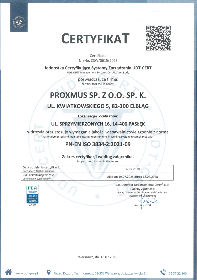- zapewnienie spełnienia wymagań jakości dotyczących spawania materiałów metalowych zgodnie w wymaganiami normy PN-EN ISO 3834-2:2021-09,